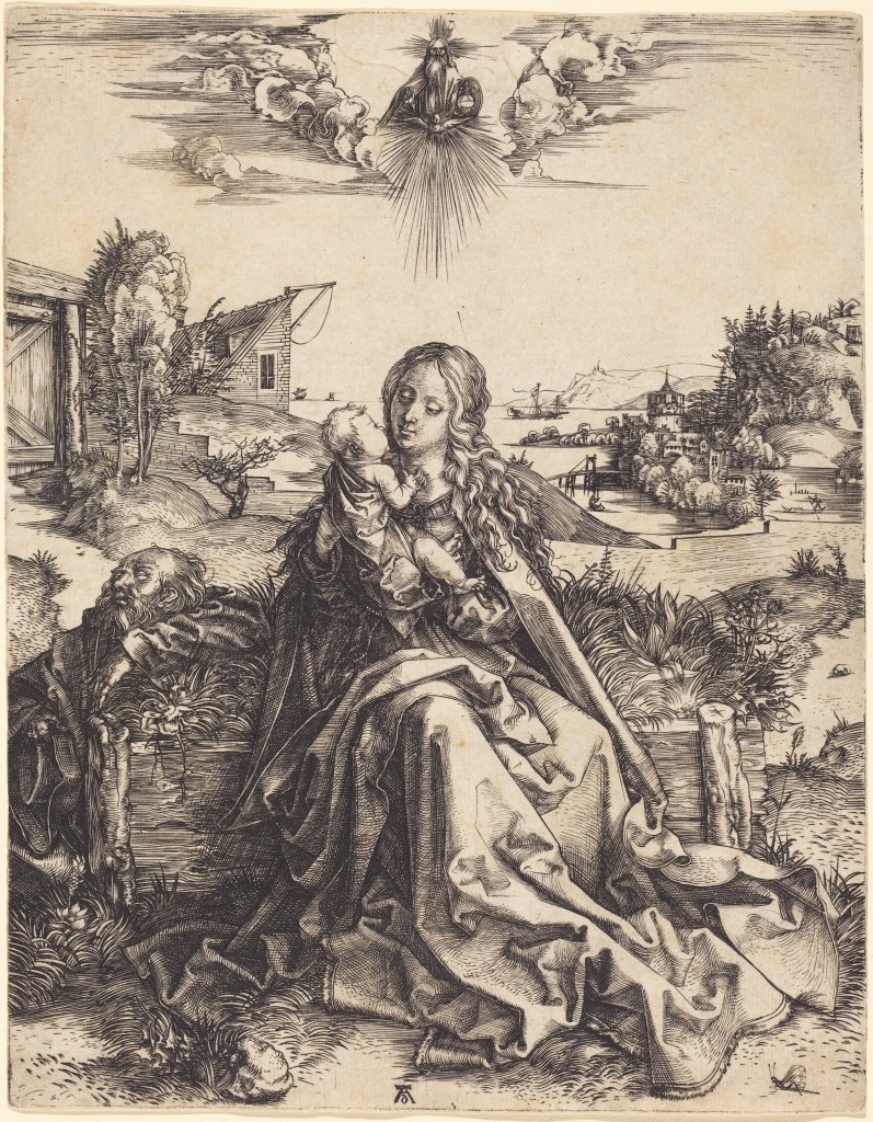 In Dürer’s Holy Family engraving, the mayfly accompanies a woman and her child embracing in a meadow below God residing in the sky. While it’s possible for the depicted insect to be a butterfly, dragonfly, or a mayfly, the symbolic juxtaposition of a metamorphic insect with woman, child, and God, explicitly and paradoxically connects change, impermanence, ephemera, with God, the omnipresent force that codes the natural world. In their essays contained in Merchants and Marvels, Larry Silver and Pamela Smith propose an explanation for the symbolism behind the mayfly and its inclusion in Dürer’s engraving: